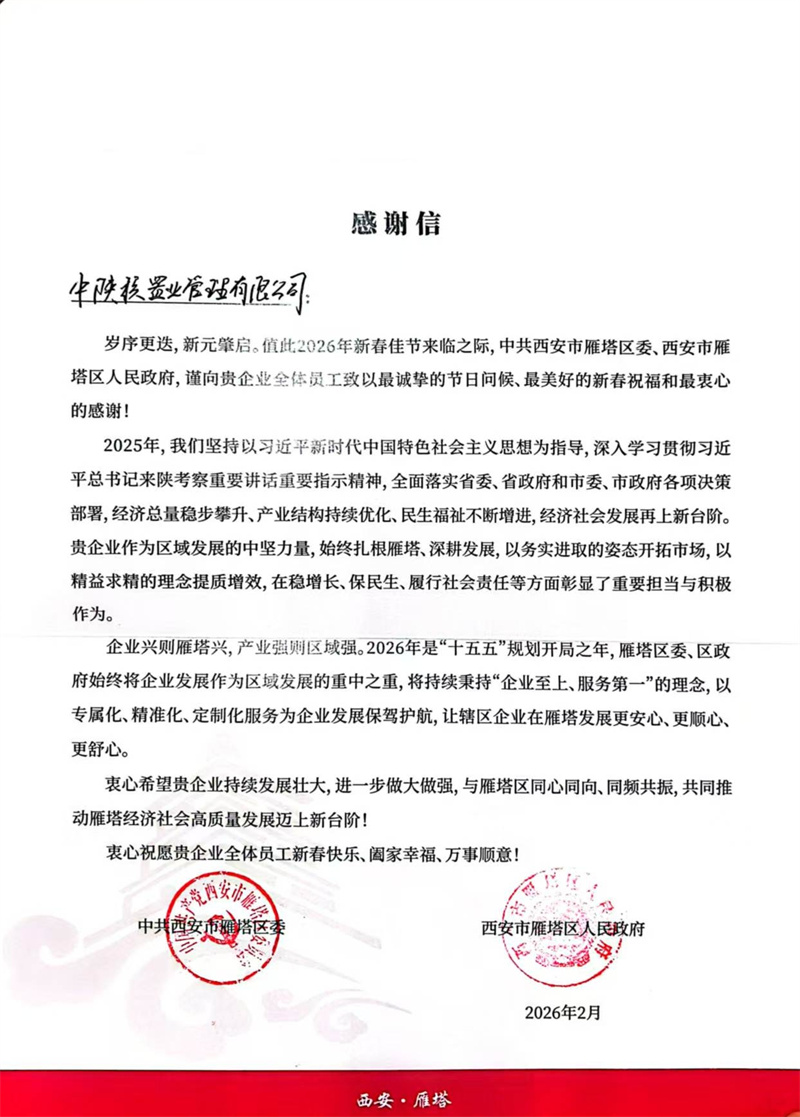 岁序更迭,新元肇启。在2026年新春佳节来临之际,中陕核置业管理有限责任公司收到了中共西安市雁塔区委、西安市雁塔区人民政府发来的感谢信。信中,雁塔区委、区政府向公司全体员工致以诚挚的节日问候和美好的新春祝福,对公司在2025年为区域经济社会发展作出的积极贡献表示衷心感谢。