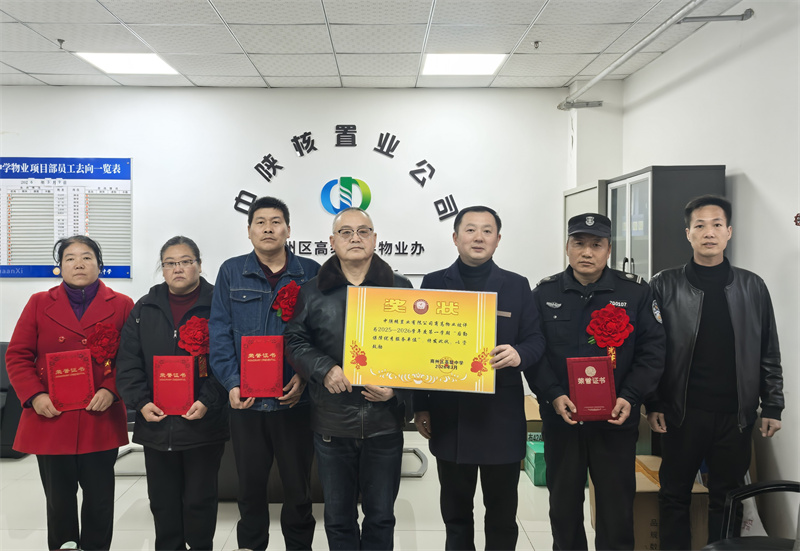 2026年3月11日,商州区高级中学校领导在开学典礼上授予“中陕核置业公司商高物业办”2025—2026学年度第一学期《后勤保障优秀服务单位》荣誉称号,并表彰了物业办冀谦、李瑜、周艳艳、赵俊虎四名先进个人。商高物业从校总务处直管九家后勤单位中脱颖而出获得唯一殊荣,是学校充分肯定了物业办在公寓管理、安全保障、维修维护、环境卫生等重要领域的突出表现与专业服务。